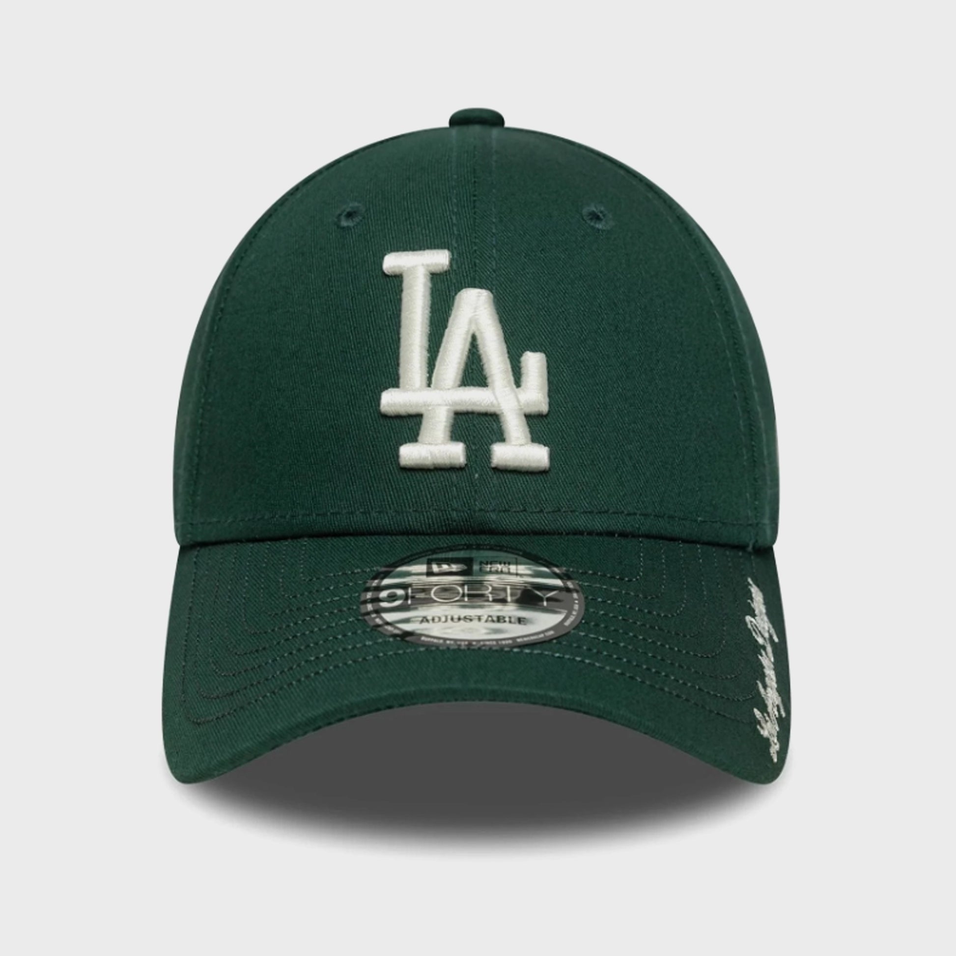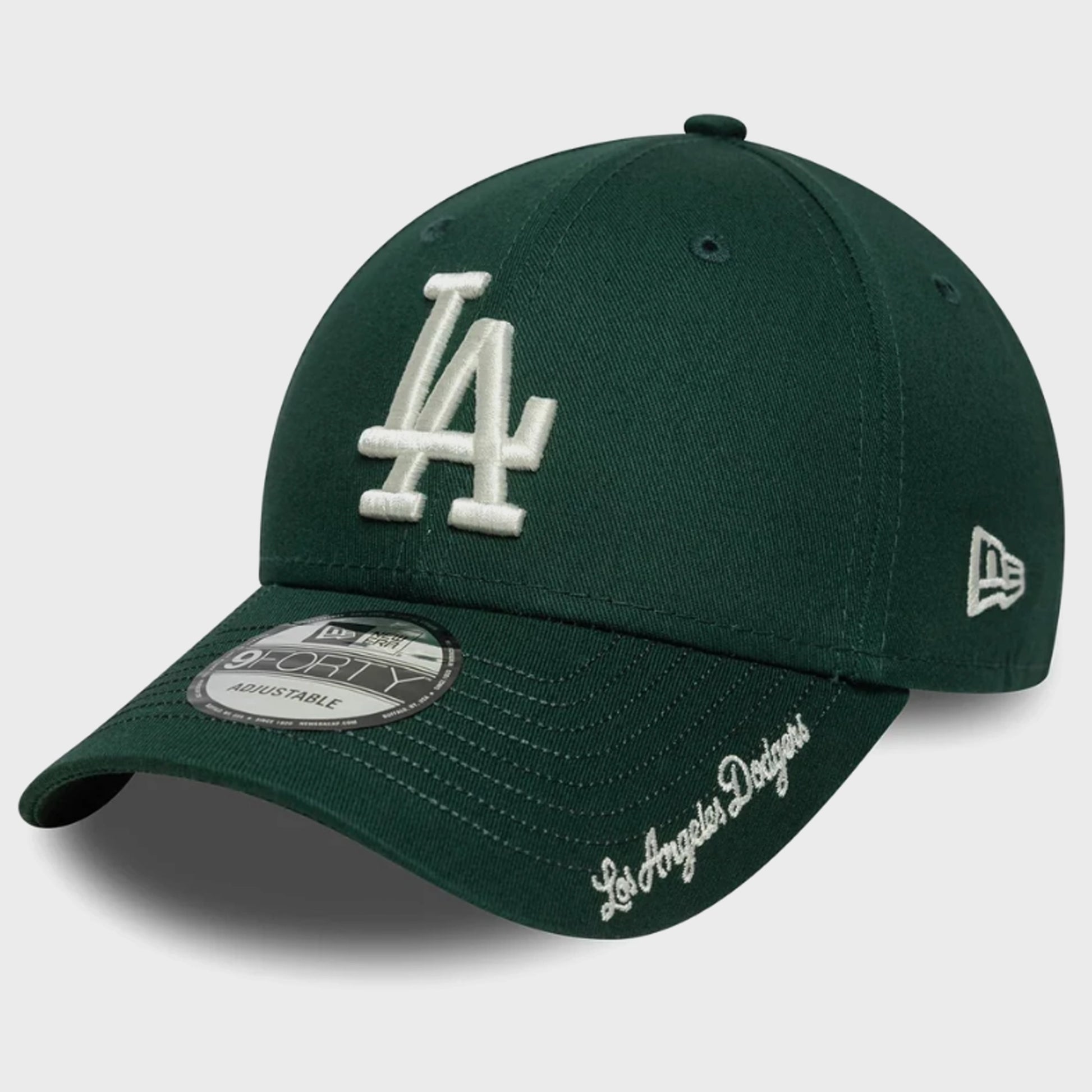 Gorra New Era Los Angeles Dodgers – Visor Script Green, un modelo clásico con un toque distintivo gracias al script bordado en la visera. Su diseño en color verde profundo ofrece un estilo moderno y versátil, ideal para uso urbano y para fanáticos del equipo.